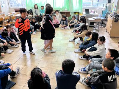 体育の時間には、長縄跳びに挑戦しました。声を掛け合いながらリズム良く跳ぶ姿からは、この1年で育んだチームワークの良さが伝わってきます。
