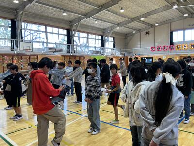 2年生はさよなら集会に向けて体育館背面の装飾の準備をしました。