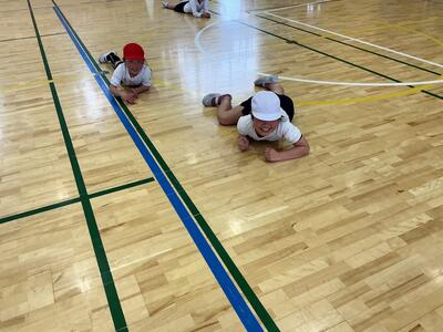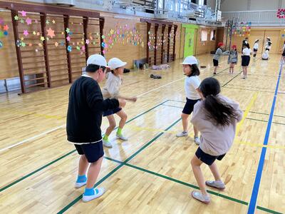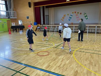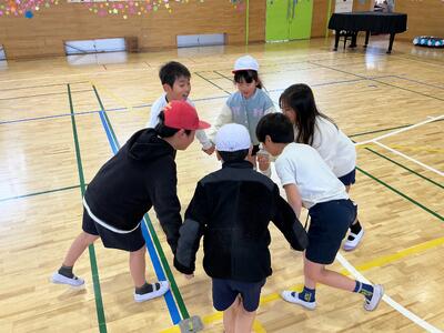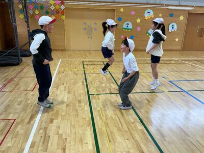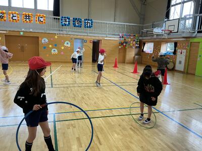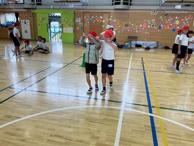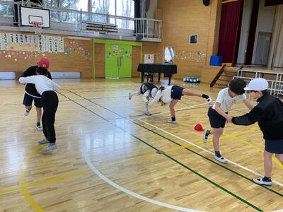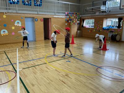 体育では、体つくり運動の多様な動きをつくる運動の学習をしています。まずは、両足でジャンプをして体のバランスをとったり、走って体を移動したり、フラフープを操作したりするなど、基本的な動きを紹介して楽しみました。次の時間では、班ごとに基本的な動きを工夫してみました。例えば、両足ジャンプを片足ジャンプにしてみる、友達の真似をして移動する、フープをくぐり抜けるなど、たくさんの動きを思いつき工夫することができました。「1人もいいけど、友達と一緒だともっと楽しい」「勝負するとどきどきしてもっとやりたくなる」など、協力したり、考えを伝えたりしながらとても楽しそうに活動していました。