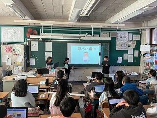 初めて他クラスの友達に披露するとあって、最初は緊張した面持ちでしたが、どの班も自分たちがまとめた成果を精一杯伝えようと頑張っていました。また、発表後には互いの良い工夫を見つけ合い、「もっと分かりやすくするにはどうすればいいか」と自分たちの発表をブラッシュアップしようとする頼もしい姿も見られました。