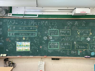 国語の学習で取り組んできた「ひみつ調べ」の発表会を行いました。 子どもたちは、日常生活の中で「なぜ?」「どうして?」と疑問に思ったことをテーマに選び、図書室の本を使って詳しく調査してきました。