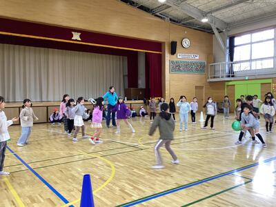 内容は3色ドッジボールと増やし鬼ごっこをしました。3色ドッジボールでは,ボールを3つ使ってゲームをしたので,いろいろな方向から飛んでくるボールに素早く反応し,逃げたり,取ったりしていました。