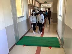 アイマスクをして,視覚障がい者の生活を体験しました。