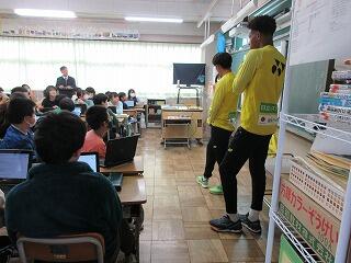 16日(木)6校時に2組で,国際NGO団体セーブ・ザ・チルドレンと柏レイソルと連携した,子どもの権利に関する学習を行いました。セーブ・ザ・チルドレンのスタッフの方と柏レイソルの山本桜大選手,オウイエ・ウィリアム選手と一緒に子どもの権利について考えました。