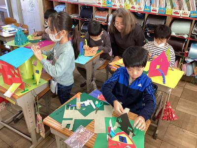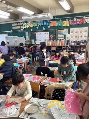 2年生は図画工作科「かぶってへんしん」の学習で,色とりどりのお花紙を用いて,お面作りをしています。お花紙を,水で薄めたせんたく糊につけながら,お面となる台に貼り付けていきます。