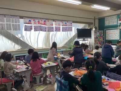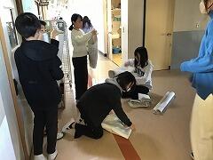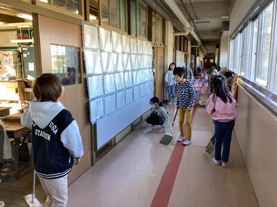 5年生は,卒業式に向けてたくさんの準備をしてきました。鳩や星の形を切って,体育館の壁面を飾りました。また,6年間の思い出を絵物語りのように作って6年生の廊下に掲示しました。前日には,清掃や椅子並べ,靴箱や教室の装飾をしました。