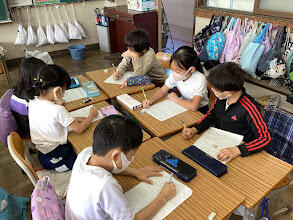 水に触れたところだけ色が変わり文字が浮かび上がる特殊な紙に,水をつけた筆で文字を書く活動をしました。子供たちは初めて持つ筆に興味津々で,何度も何度も文字を書き活動を楽しんでいました。
