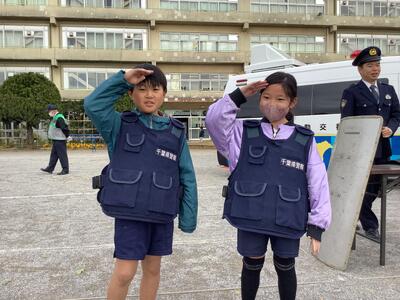 授業の後半では,警察官の使う道具や警察車両を展示をしていただき,子どもたちが実際に道具を身につけたり,車両に乗ったりして,警察の仕事について興味津々な様子でした。普段は体験できない貴重な学習をすることができました。