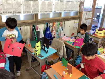 せんたく糊がたくさん手につきながらも,自分のつくりたいお面を黙々と作っている子供たちに感心しています。
