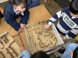 2組さん。木のパズルで頭の体操中。カードゲームも人気です。