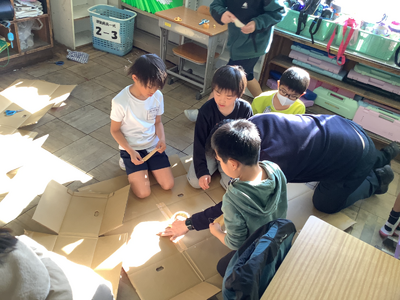 2年生は算数で,「はこの形」について学習しています。お家から持ってきた箱を工作用紙に写し取り,実際に箱を組み立てました。箱が完成すると,子供たちは「お菓子の箱とそっくり!」「サイコロみたいな箱ができた」など,うれしそうに話していました。今後は完成した箱を活用して,箱の面の数や形など理解を深めていきます。お家でも,空き箱の準備など,ご協力いただきましてありがとうございました。