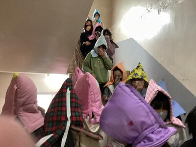 2月1日(木)の5時間目に火災を想定した避難訓練を行いました。外まで避難したのは,久しぶりでしたが,どの学年も静かにすばやく行動することができました。火災のときは防火シャッターが降りるため,今回は非常扉を使用して避難しました。また,火災のときは煙を吸い込まないように鼻と口を覆うなど,訓練を通して確かめました。