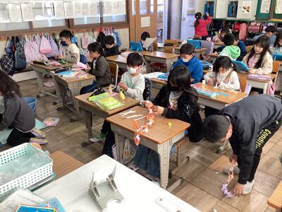 2年生の生活科では「自分はっけん」というテーマで,自分自身の成長を振り返る学習を進めています。2月27日の授業参観では,一人ひとりができるようになったことや頑張ったことなどを発表します。発表会に向けて,子供たちはプログラムについて話し合ったり,必要な物を作ったりして準備を進めています。どの子も,参観するお家の方々に楽しんでもらおうとはりきって活動していました。