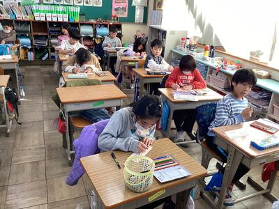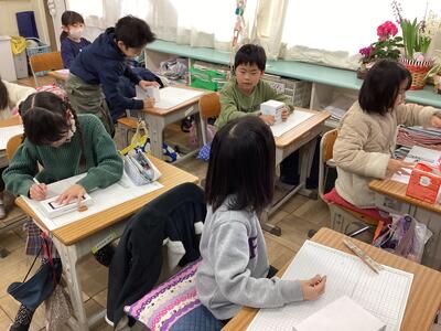 硬筆とは異なる感覚の毛筆。その感覚の楽しさからか,字を書く集中力が高く,なんだかいつもよりもさらに良い姿勢で文字を書く姿が,とても立派に見えました。新しいことをたくさん学ぶことのできる3年生が楽しみになった様子で,とても嬉しく思います。