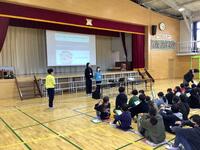 前半は,体育館でバスに乗るときのマナーや乗り方,時刻表の見方などについて学びました。説明の途中では,バスについての〇✕クイズが出題され,子供たちは楽しく学んでいました。