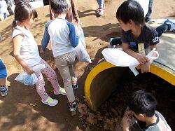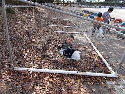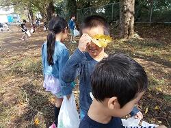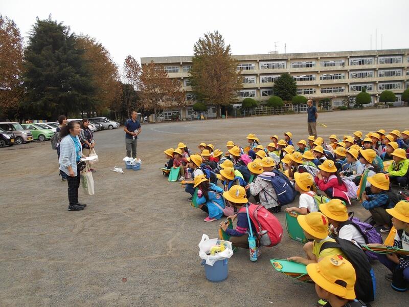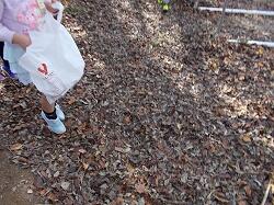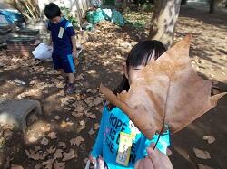 一年生が秋の「音」「色」「におい」を見つけに、校庭で落ち葉拾いをしました。