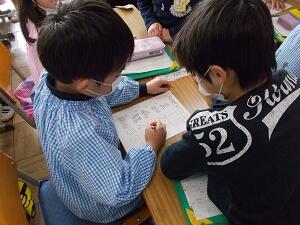 1年生は幼稚園生と手をつないで,学校案内をしたり,教室でプリントを教えたりしました。