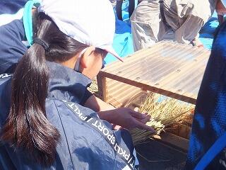 到着したら下田の杜の方の説明を聞いて,いざ脱穀!