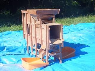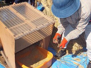 その稲を足踏み脱穀機で稲穂から籾を取っていきます。