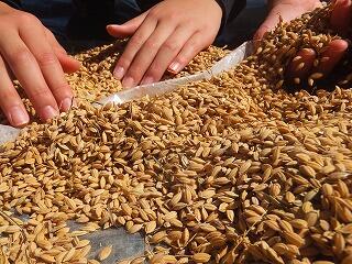 その後,唐箕(とうみ)を使って籾とわらくずを選別します。風の力を使って分けていくので,風の強さを調節するためにお互いに声をかけて協力していました。