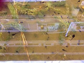 校庭の池では,おたまじゃくしが元気に泳いでいます。