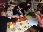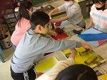 図工では,「ほると出てくる不思議な花」の学習で,版木にインクをつける作業をしました。色の組み合わせを考え,カラフルな台紙を刷りました。