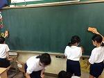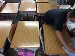 中性洗剤を使って机を水拭きしたり,ほうきでゴミを集めたりしています。