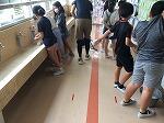学校では,感染症対策の一つとしてトイレや流しを使うときのソーシャルディスタンスをビニールテープで示すことにしました。