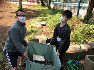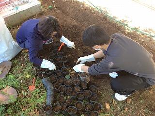 先生たちも花だんを耕し,肥料も足してツルレイシの種を植えました。