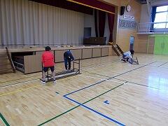 入学式の準備では,体育館入口やギャラリーの装飾や紅白幕の設置,ひな壇の設営などを行いました。中川先生と大貫先生がギャラリーの装飾を直している間に,加藤先生は紅白幕をつけていました。紅白幕をつけながらふとギャラリーに目を向けると,監督と作業員かと思うような2人の連携がありました。