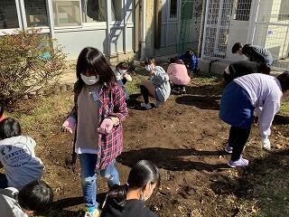 畑を耕す際には,草取りや土の掘り起こしなど分担をしながら活動しました。草取りをする中で,雨水栓を見つけ「宝だ~!」と言いながら楽しそうに掘り出している姿に,5年生の素直さを感じました。