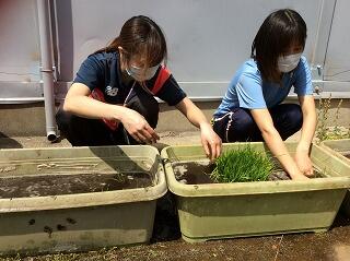 その後,水を張り,土となじませて,苗を植えました。