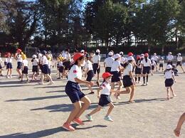 かねてから6年生の実行委員が企画してきた1年生との3色運動会です。
