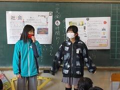 ★カメラに向かって発表する2年生 ★2年生の発表を聞く1年生