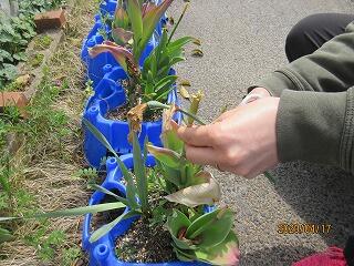 残念ながら休校中に枯れてしまった花もあったので,今日はチューリップの花がら摘みをしました。