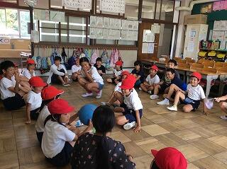 今日の酒小タイムに,今年度初めての「いっしょにあそぼう」がありました。「いっしょにあそぼう」は縦割り活動で,1年生は6年生とペアを組んで行います。今日は,1年生と6年生の教室にわかれて室内遊びをしました。自己紹介をした後,爆弾ゲームやハンカチ落としなどをして盛り上がりました♪とても楽しかったようで,終わりになると「もっとやりたいー」という声が聞こえてきました。
