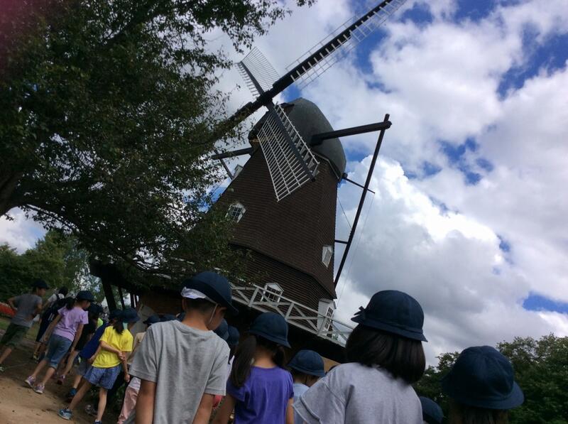 公園に着くと、まずは橋を渡って童話館や風車を見学しました。