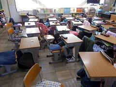 地震が起こったら,その場で安全確保行動(まず低く,頭を守り,動かない。)をとることが大切です。命を守るための訓練です。自然と体が動くように,学校では繰り返し行っていきます。