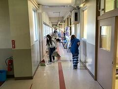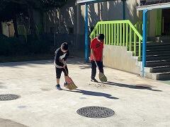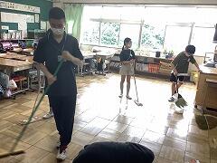 休み時間には子どもたちと汗を流し,清掃活動も一緒に取り組んでいます。
