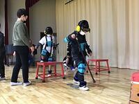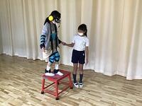 その後,先生たちも前に出て,体の大きさを比べたり,話しかけられても逃げる練習をやったりしました。