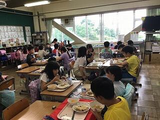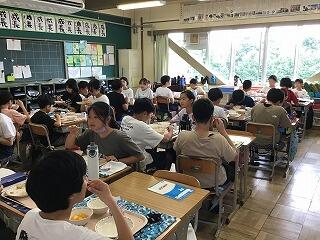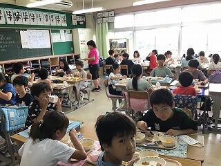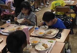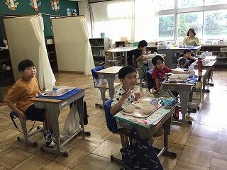 4時間目の授業の途中から,ソワソワしている子がちらほら・・・。何を隠そう,今日から2学期の給食が始まります。4時間目の授業が終わると「よし,給食だ!」と聞こえてきました。やっぱり給食は楽しみですね。みんなで力を合わせて給食の準備をして,笑顔で「いただきます!」をして食べ始めました!みんなとても嬉しそうです!!