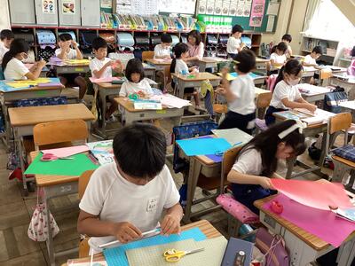 2年生は図画工作科「のりのりお花紙で」の学習で,色とりどりのお花紙を用いて,作品を作りました。お花紙を手で細くちぎったり,ハサミで切ったり,ちぎったものを重ねたり,しわをつけたり,様々な工夫をしました。