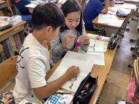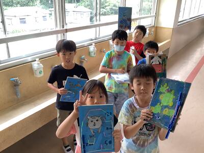 先週から,図工の学習で模様作りをしました。先週は,絵の具と洗剤を混ぜて色付きの泡を作り,画用紙に写しとりました。今週は,ペットボトルキャップを使って丸い形を写したり,できた模様を生かしてクレヨンで絵を描いたりしました。子供たちは,「おもしろい!」「シャボン玉みたい!」と楽しみながら活動に取り組んでいました。模様を生かした素敵な作品が完成しました。