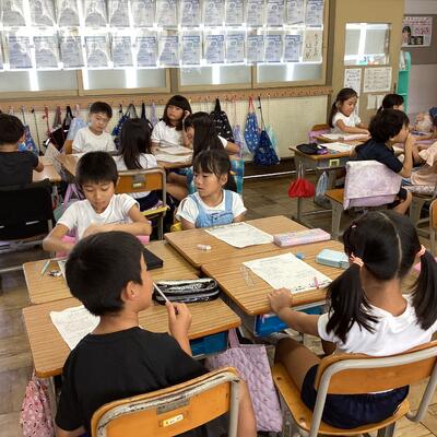 始業式では,校長先生のお話以外に,校歌斉唱,夏の席書大会の表彰,養護教諭(保健室の先生)のお話(熱中症予防について),9月の生活目標「時間を守って行動しよう。」ついてのお話がありました。