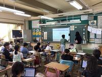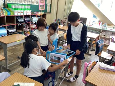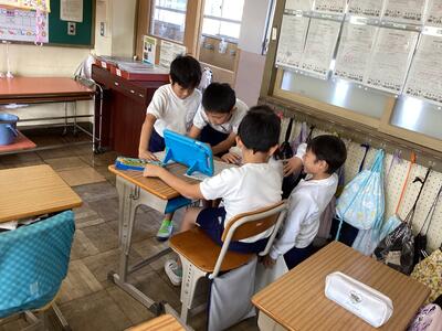 2年生の生活科では,町たんけんで学んできたことをふり返る学習が始まりました。見学場所のグルーブごとに集まってタブレット端末を活用して写真を選んだり,見学からわかったことを整理したりして,スライドにまとめています。グループのリーダーを中心に,「どの写真を使おうか?」「どんなことを書けば良いかな?」と話し合いながら,協力して活動していました。