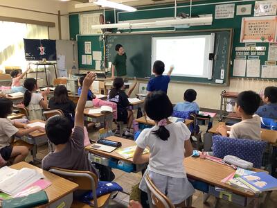 農業の学習では、ほうれん草などを栽培している農家さんとオンラインでつなぎ、実際に栽培しているところや出荷までに使う機械などを見せていただきました。普段は見ることのできない農家の様子に子どもたちは興味津々に説明を聞き、最後の質問タイムではたくさんの質問が出ていました。