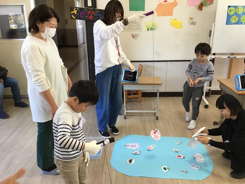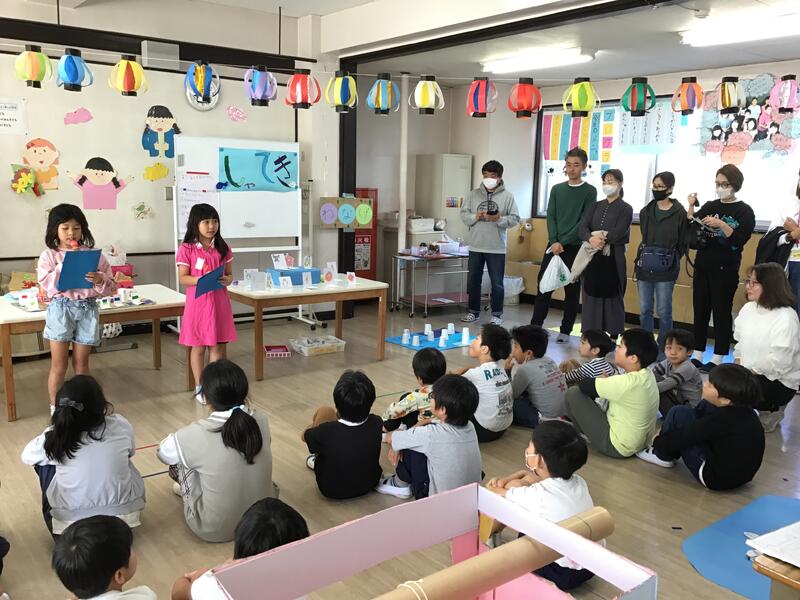 掲示物作りを行いました。「秋といえば何をイメージする?」の問いに,「どんぐり」「紅葉」など色々な単語が出てきました。「○○は秋かな?」と質問する子どもたちもいて,季節について考える機会となりました。