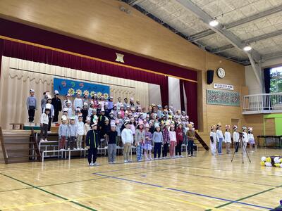 「いよいよ次は1年生の発表だ」「どうしよう」「大丈夫かな」,1年生の前の4年生の発表が終わった後,皆,緊張した顔で話していました。練習のときはいつも「しっかりと息を吸って大きな声で歌うこと」「本番は1回だから,最初から声を出すこと」を目標に頑張ってきました。「大きなかぶ」では,「よいしょよいしょ」のかけ声とかぶを引っ張る動作を頑張りました。1年生の発表のとき,2年生から6年生が楽しそうに見ていました。一緒にかけ声をかけてくれた人もいて,とても楽しい発表になりました。「きょうもあしたも一年生」では,ブレスをそろえて歌うことを頑張りました。きれいな声て歌うことができ,よかったです。