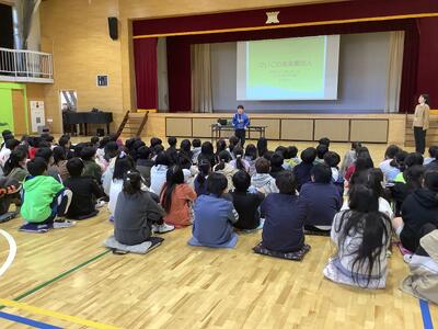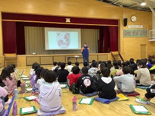 総合的な学習の時間「くらしやすい町をめざして」の一環で,未来介護案内人の方にお越しいただき,お話を聞きました。今回は実際に介護施設で働いている方に仕事についてお話をしていただき,この仕事についたきっかけや,やりがい,休みの日に何をしているのかなどを教えていただきました。大変な仕事となんとなく認識していた児童達ですが,具体的にどんなことをしているのかを知ることができたようです。お風呂は座ったままで入れるお風呂や,寝たまま入れるお風呂があり,利用者さんが快適に過ごせるような工夫や手立てを考えていることを学びました。