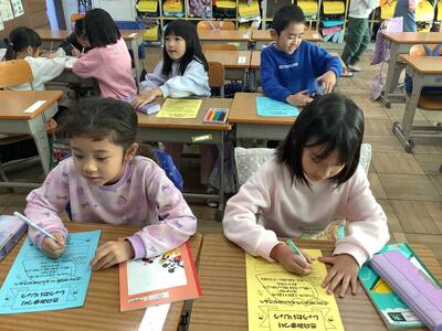 国語で「こころがあたたかくなる手がみ」を学習しました。これは,身近な人にありがとうの気もちを伝える手紙を書く学習です。1年生は,入学から今まで,朝の支度や掃除などのお手伝いをしてくれたり,休み時間に一緒に遊んでくれたりした6年生に手紙を書きました。大好きな6年生へ手紙を書くということで,皆,一生懸命に書き,手紙の用紙に描かれたイラストの色塗りも丁寧にやっていました。